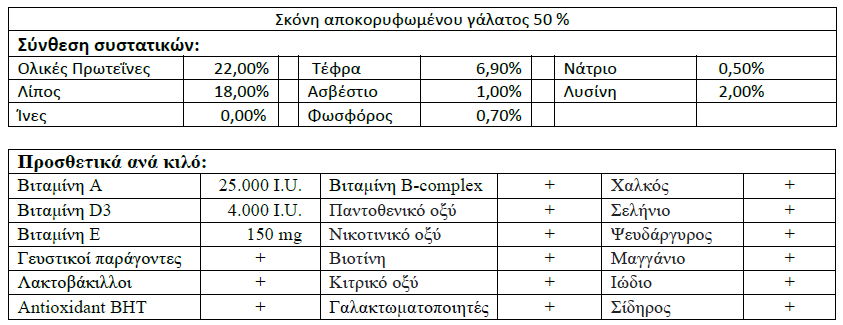 Είναι ένα ποιοτικό υποκατάστατο γάλατος με 50% σκόνη αποκορυφωμένου γάλατος για μοσχάρια.