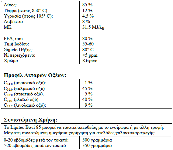 -Το Lipitec Bovi 85% μπορεί να ταϊστεί όπως είναι, ως τροφή ή να χρησιμοποιηθεί στο ολικό σιτηρέσιο.